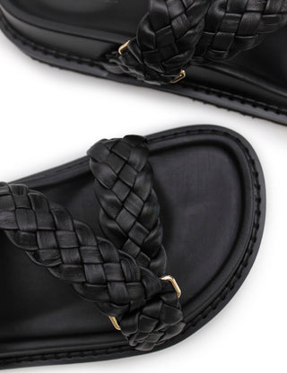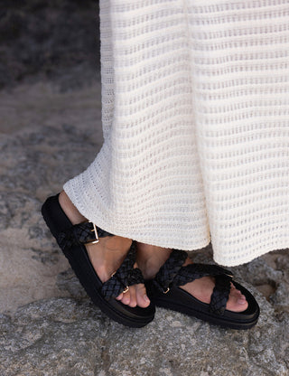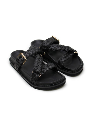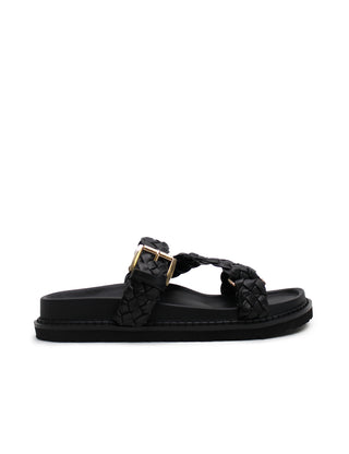The Aki Braided Slide features an elevated handwoven strap that sits on a molded footbed. Gold buckles allow for strap adjustment for the perfect fit.