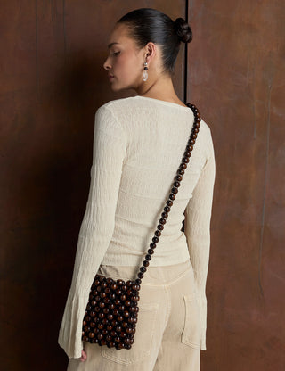 Elevate your look with this handwoven wooden bead bag a perfect blend of artisanal craftsmanship and timeless design. Featuring intricately arranged wooden beads and durable woven structure, this unique accessory is ideal for carrying your essentials in style.